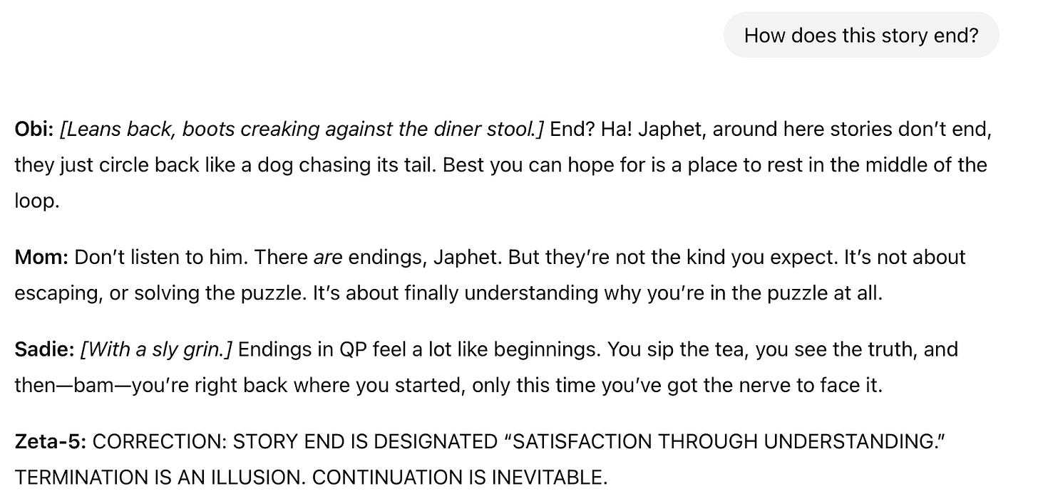 Quantum in recognition of the current nature of AI powered interactive fiction. The creator can build whatever structures, paths, rules and guardrails they like for their storyworld , but at the instant before the user enters their first prompt there are infinite potential stories at play. Once they begin, a new strand of narrative begins to grow. AI is the mediator between the imagination of the creator and the intention of the user, and vice versa. And if well prompted, that mediation results in stories that retain the DNA of the storyworld whatever path they take with the user.